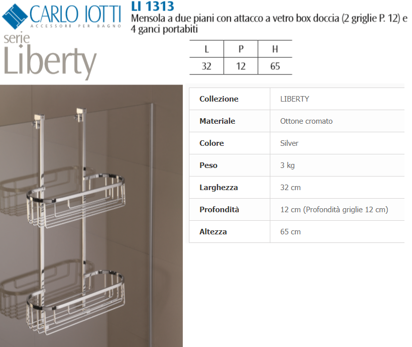 Raffinata e moderna, la collezione di design LIBERTY in ottone cromato, arreda il box doccia utilizzando un concept assolutamente innovativo: le capienti griglie ovali, disponibili in diverse profondità e larghezze, possono essere fissate o appoggiate al box doccia, trasformando la stanza da bagno in un ambiente elegante e funzionale. Le mensole delle collezioni LIBERTY sono predisposte per il fissaggio a vetro, attraverso pratici ed innovativi ganci a vite e si adattano a box doccia con spessori di 4, 6 fino a 8 mm.