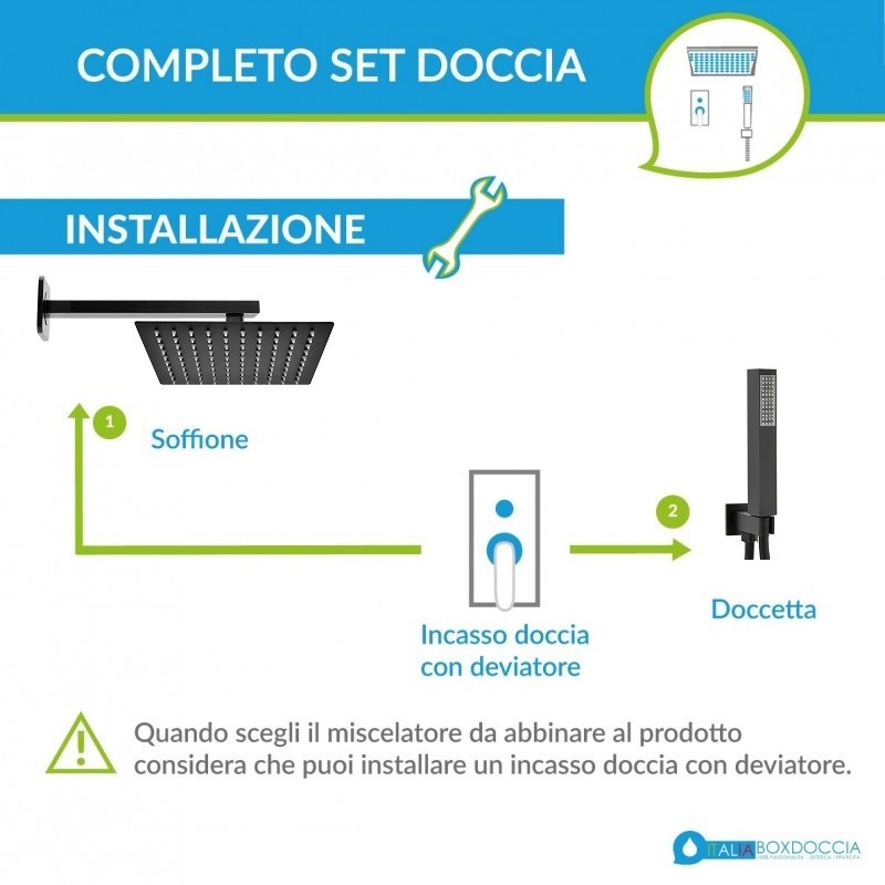 I set doccia proposti da ItaliaBoxDoccia si abbinano perfettamente con qualsiasi tipo di arredo bagno, miscelatori da incasso con deviatore e di vasche da bagno; grazie a questa versatilità, il montaggio e l'utilizzo di queste composizioni doccia sono molto facilitati.