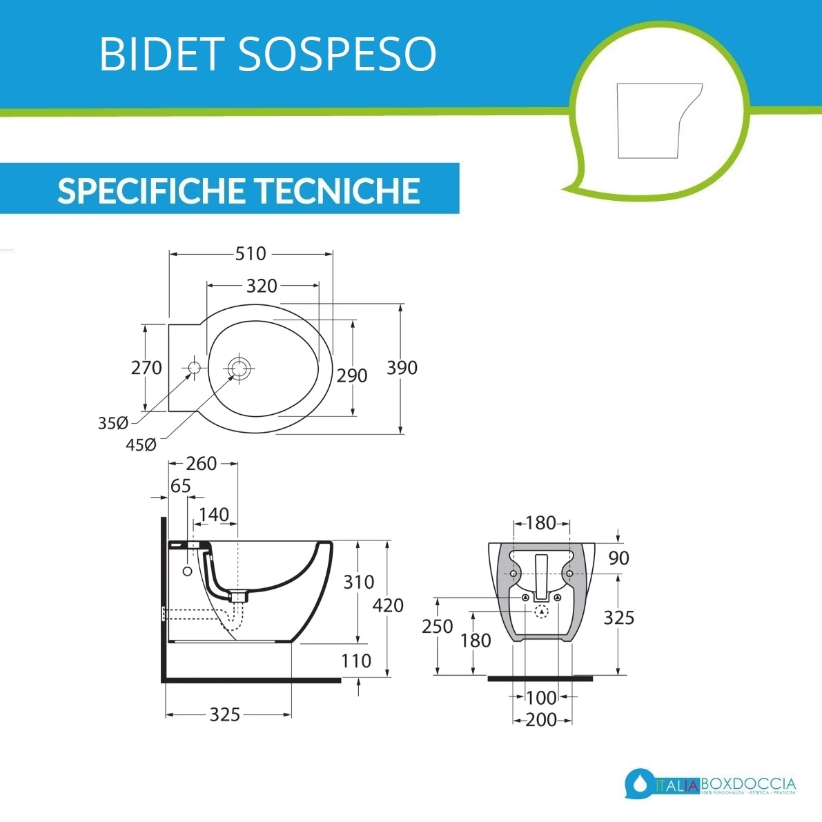 Il bidet sospeso riduce l'ingombro dei sanitari e facilita le operazioni di pulizia del bagno. Lo scarico a parete del wc può essere trasformato in scarico a pavimento utilizzando una curva tecnica acquistabile separatamente.