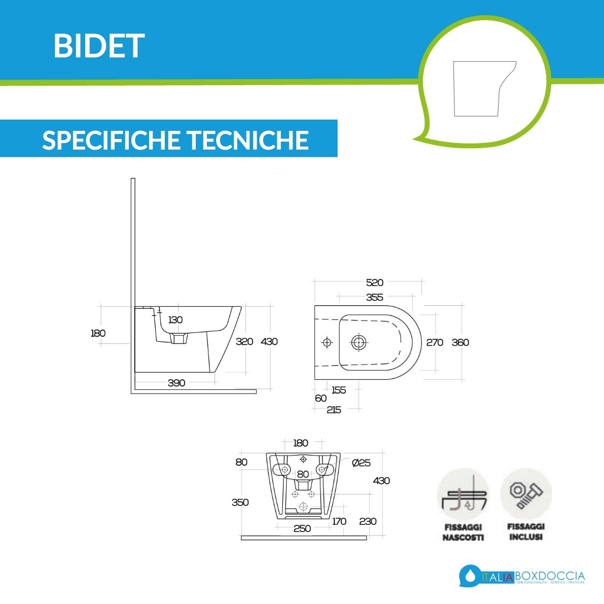 • Bidet sospeso modello FEELING monoforo per rubinetteria con troppopieno