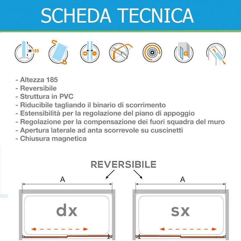 Il pvc è un materiale acrilico impiegato nell'arredo moderno per le sue elevate proprietà di resistenza e durata. I profili in acrilico si caratterizzano per la loro solidità e il peso contenuto. L'impiego del pvc rende questi box doccia riducibili tagliando il profilo, adattando la dimensione alle proprie esigenze. La porta doccia scorrevole è dotata di sistema scorrevole di chiusura magnetica, in grado di facilitare la chiusura del box ed evitare urti accidentali. Il pannello acrilico con effetto Bollicine da 3 mm migliora la sicurezza del tuo box doccia offrendo un prodotto economico. I profili di scorrimento color bianco pastello possono ridursi di 4 cm, facilitando l'installazione del box doccia anche in nicchie fuori misura. I cuscinetti rendono l'apertura semplice ed immediata. L'altezza di 185 cm consente il montaggio del box in ogni tipologia di nicchia. L'installazione del box è reversibile: si può montare sia con apertura destra sia con apertura sinistra, in base alle proprie esigenze. Il sistema di apertura scorrevole si rivela essenziale anche in spazi molto ristretti giacchè non crea alcun tipo di ingombro. Il box Made in Italy è fornito di istruzioni di montaggio per offrire un prodotto economico e facile da montare.