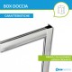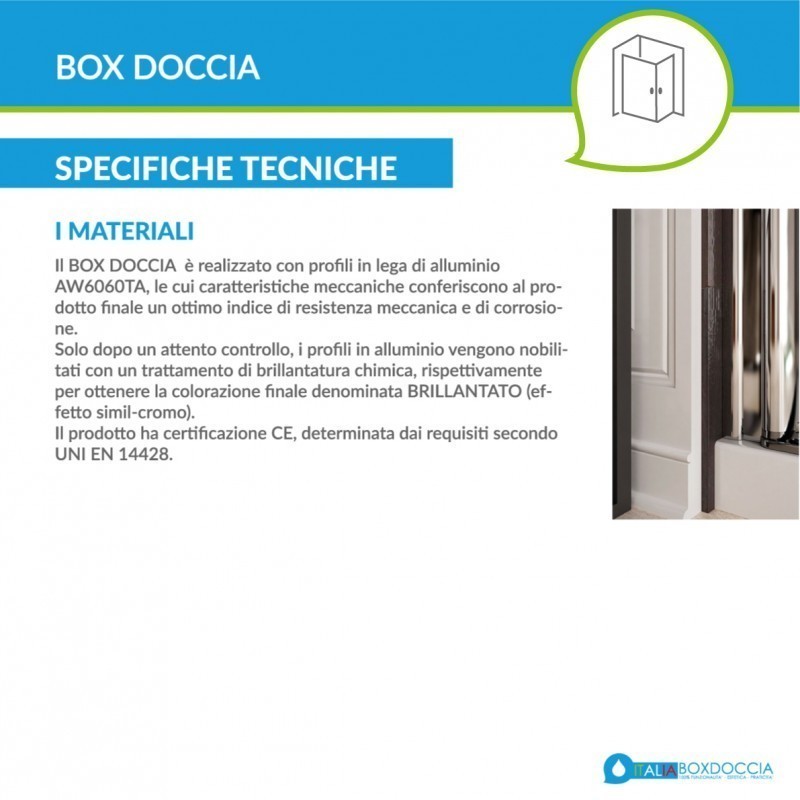 Cabina Doccia ad Angolo, costituita da una parete fissa e quattro ante di cui due fisse e due scorrevoli. Pertanto l'ingresso è caratterizzato da un ampio spazio di apertura. Il bloccaggio delle ante avviene mediante guarnizioni magnetiche.