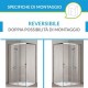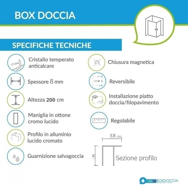Cabina Doccia ad Angolo, costituita da una parete fissa e due ante di cui una fissa e una scorrevole. Pertanto l'ingresso è caratterizzato da un ampio spazio di apertura. Il bloccaggio delle ante avviene mediante guarnizioni magnetiche