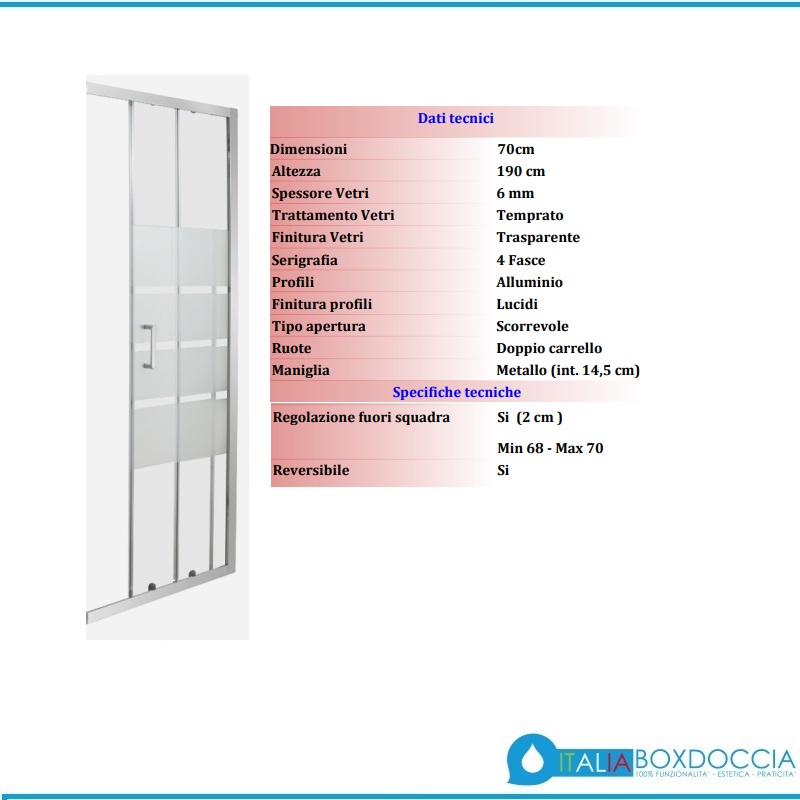 Cabina a due lati ciascuno dei quali è formato da due ante, di cui una fissa e una scorrevole. Pertanto l'ingresso è ad angolo. Lo scorrimento avviene su ruote ed il bloccaggio delle ante in posizione di chiusura è garantito da guarnizioni magnetiche sulla battuta.