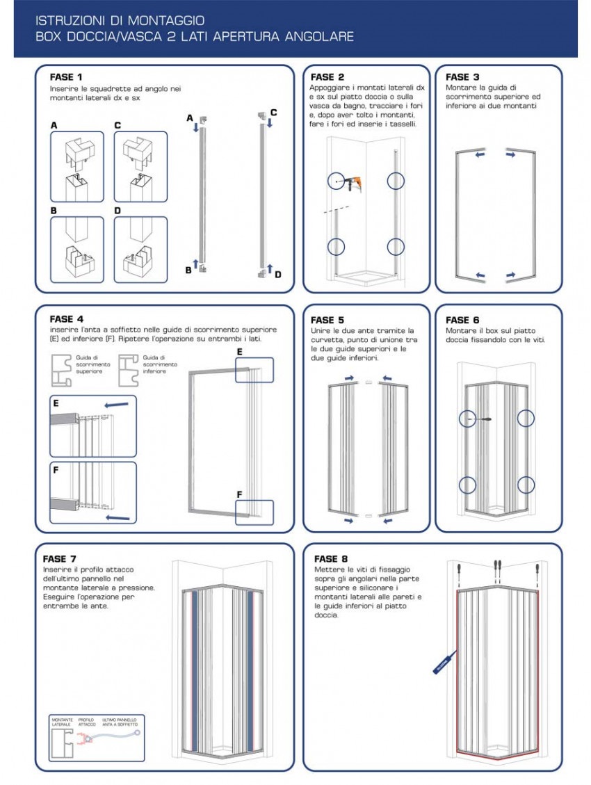 Il pvc è un materiale acrilico largamente impiegato nell'arredo moderno per le sue elevate proprietà di resistenza e durata. I profili in acrilico hanno un telaio robusto e leggero. L'impiego del pvc rende i box doccia riducibili tagliando il profilo, adattando la dimensione alle proprie esigenze. Questa nicchia è dotata di sistema scorrevole di chiusura magnetica, in grado di facilitare la chiusura del box ed evitare urti accidentali. Il pannello acrilico con effetto semitrasparente da 1,5 mm migliora la sicurezza del tuo box doccia offrendo un prodotto ergonomico. I profili di scorrimento color bianco pastello possono ridursi, facilitando l'installazione del box doccia anche in nicchie fuori misura. La maniglia esterna offre un meccanismo di apertura ergonomico. L'altezza di 185 cm facilita il montaggio del box in ogni tipologia di nicchia, garantendo la massima compatibilità. L'installazione del box doccia è reversibile: si può montare sia con apertura destra sia con apertura sinistra.