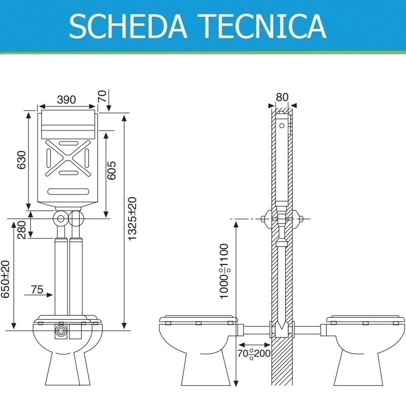 PUCCI® RAME DOPPIO PULSANTE PULSANTE BASSO PER VASI ABBINATI - PER PARETI IN MURATURA - PER WC A PAVIMENTO