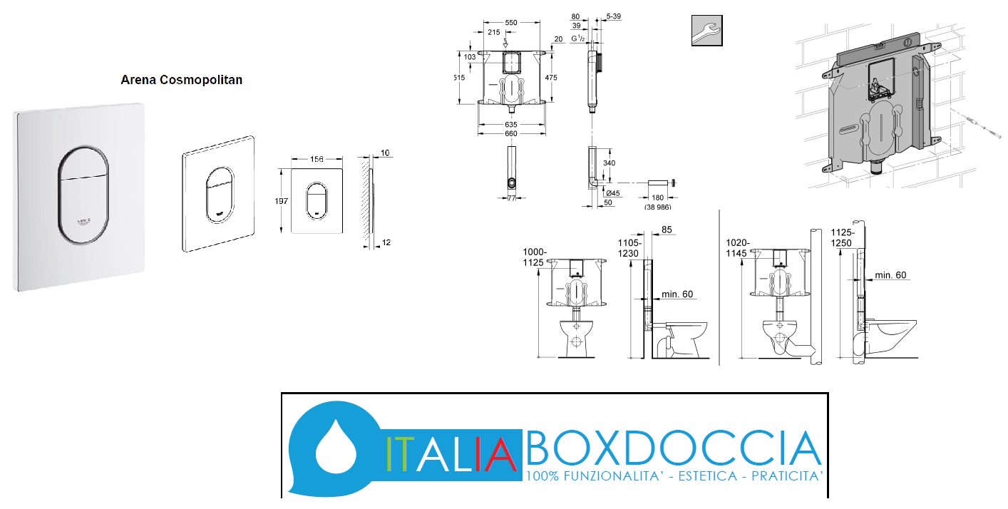 LA CASSETTA DA INCASSO GROHE E' PROGETTATA PER UNA FACIE E VELOCE ISTALLAZIONE AD INCASSO NELLE PARETI IN MURATURA. L'AZIONAMENTO AVVIENE CON COMANDO FRONTALE E' ISOLATA CONTRO LA CONDENSA LA CASSETTA INCLUDE CANOTTO DI COLLEGAMENTO. RISCIACQUO A DUE QUANTITA' (3 E 6/9 LITRI)