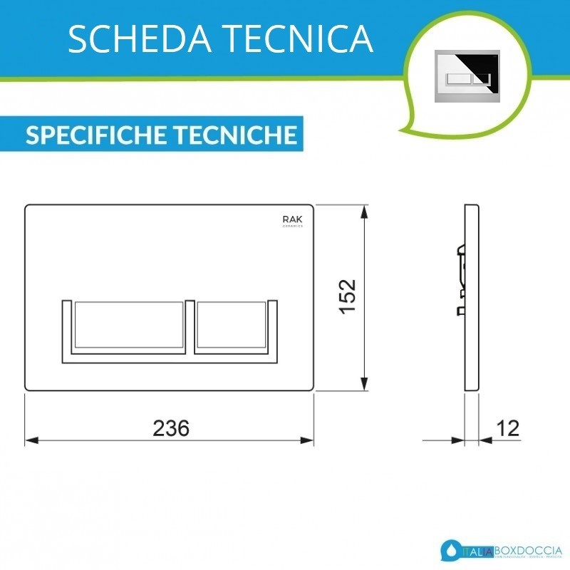 Questa placca di comando è studiata e realizzata per rendere l'ambiente bagno pratico e allo stesso tempo presenta delle finiture perfette per sposare qualsiasi tipologia d'arredo. Presenta un doppio comando per il risparmio idrico ed è studiata per l'azionamento del risciacquo con cassette di risciacquo da incasso Ecofix di Rak.