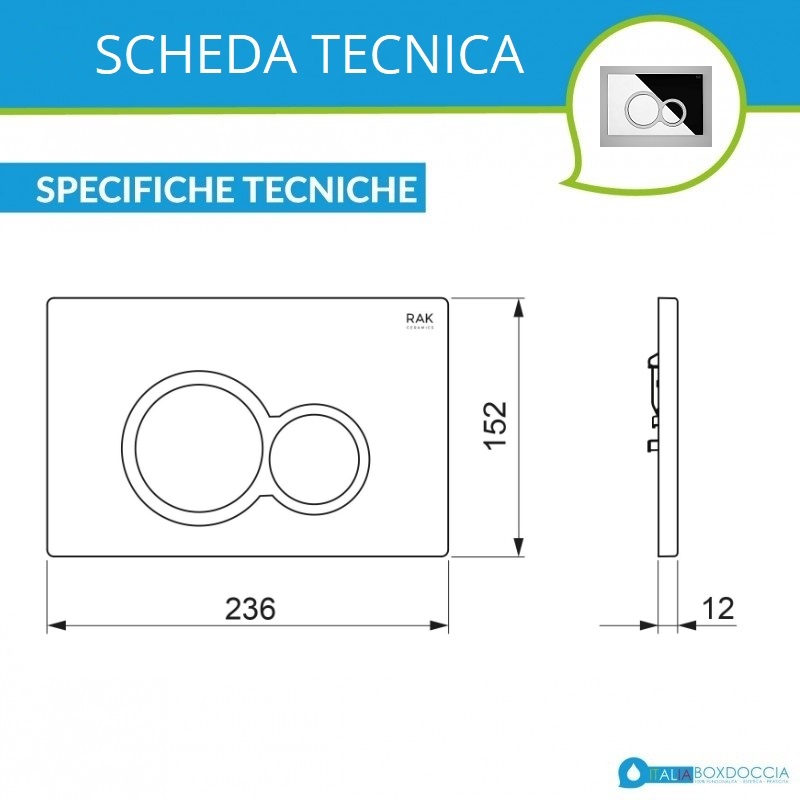 Questa placca di comando è studiata e realizzata per rendere l'ambiente bagno pratico e allo stesso tempo presenta delle finiture perfette per sposare qualsiasi tipologia d'arredo. Presenta un doppio comando per il risparmio idrico ed è studiata per l'azionamento del risciacquo con cassette di risciacquo da incasso Ecofix di Rak.