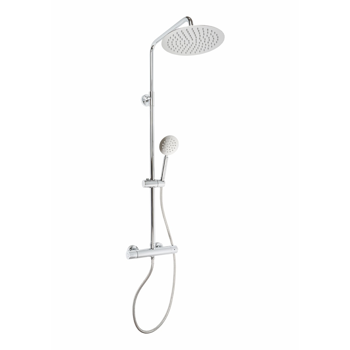 Un sistema doccia completo di tutti gli elementi è la soluzione più compatta per il tuo ambiente doccia. La struttura tubolare tonda è regolabile in altezza fino ad ulteriori 35 cm; così da poter adattare il saliscendi anche ad impianti e fori già esistenti.