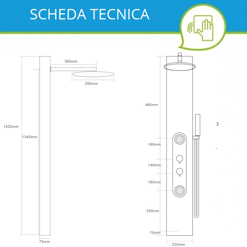 Pannello doccia in acciaio inox 304, spessore 1mm. Getto superiore a pioggia con soffione in abs. Getti idromassaggio per il corpo. Doccino con maniglia in abs e flessibile in acciaio inox da 1,5 mt per il collegamento con la doccetta. Regolatore in lega di zinco. Dimensioni: (larghezza x profondità x altezza). 22x7,5x140 cm.
