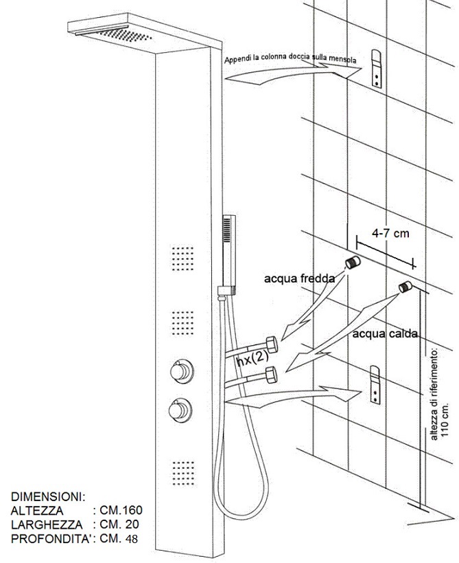 Colonna doccia multifunzione in acciaio inox con soffione, getto con effetto cascata, dotato di sistema per evitare la formazione di cristalli di calcare e la formazione di incrostazioni. L'apparecchiatura è dotata di ugelli orientati anche orizzontalmente per una più fruibile distribuzione dell'acqua.![]()