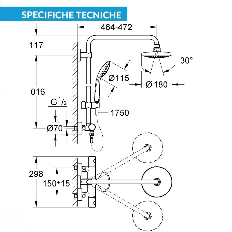 Colonna doccia dotata di un comodo sistema anticalcare per una rimozione semplice e veloce del calcare dagli Ugelli del Soffione.