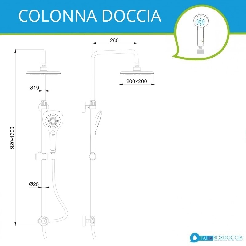 Colonna doccia con asta in acciaio dotata di soffione quadro 20x20 cm in abs, doccetta quadra da 12x26 cm multifunzione a tre getti e flessibile a doppia aggraffatura. La colonna doccia proposta ha interasse di installazione regolabile per poter sfruttare fori già esistenti.