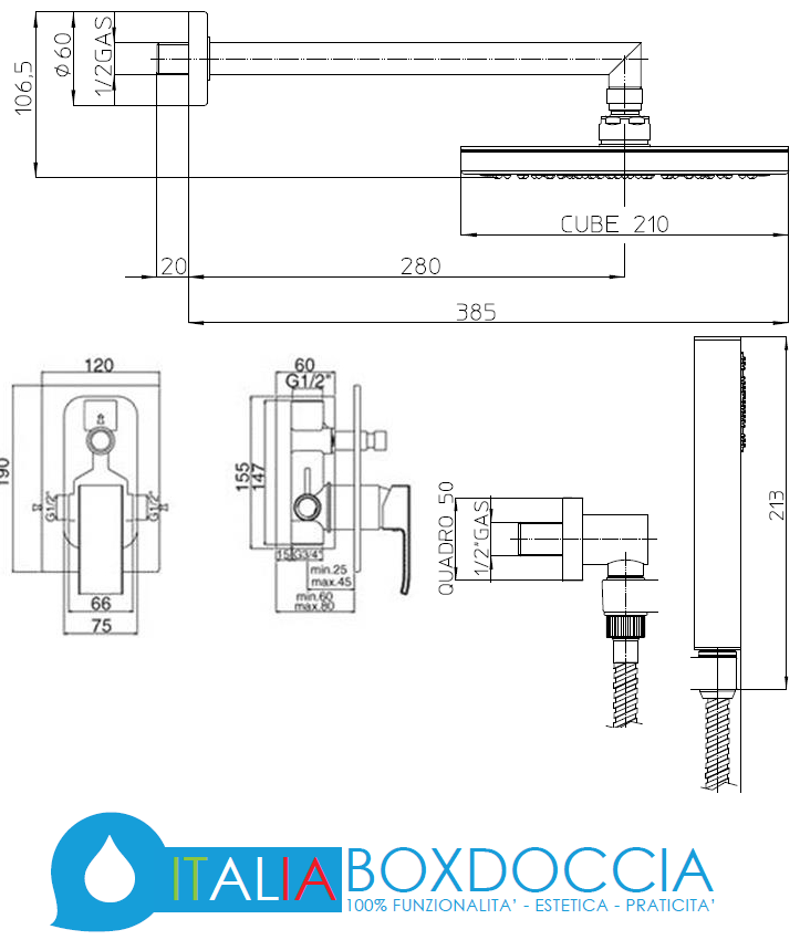 - 1 Braccio con Soffione in Ottone Cromato doccia 21x21 cm Cube Marca Bossini modello H70720 Cube 210