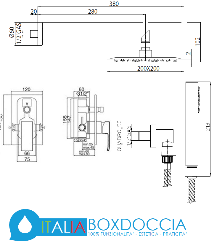 - 1 Duplex doccia con supporto fisso, flessibile ottone doppia aggraffatura cm 150 e presa acqua 1/2”M Marca Bossini modello C50001 Cube
