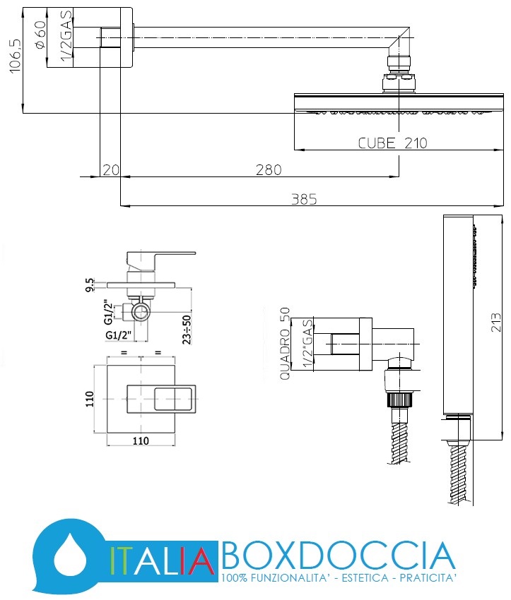 - 1 Braccio con Soffione in Ottone Cromato doccia 21x21 cm Cube Marca Bossini modello H70720 Cube 210