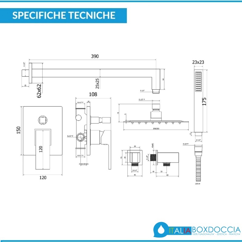 - 1 Soffione doccia quadro anticalcare ispezionabile