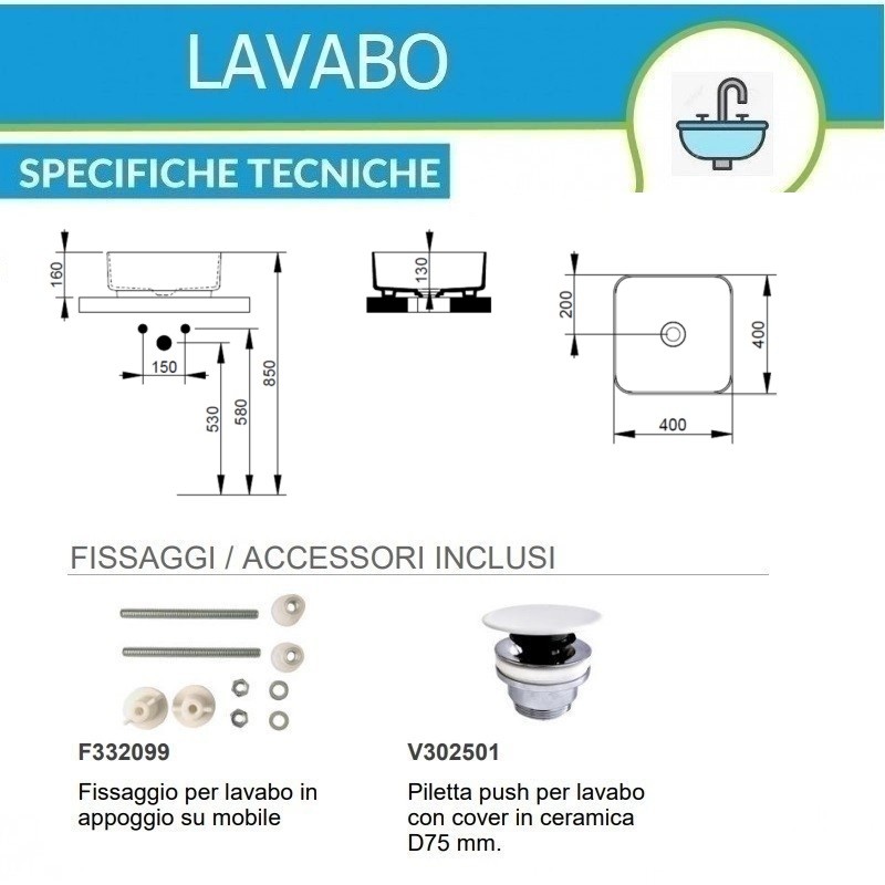 • Dimensioni lavabo: larghezza 40 x profondità 40 x altezza 16 cm.
