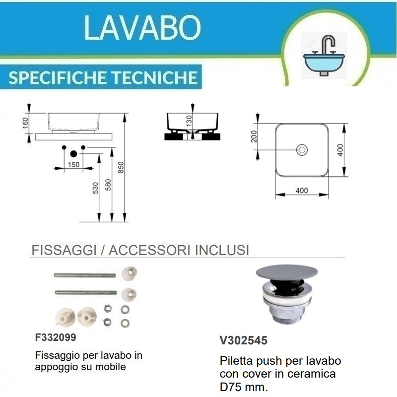 • Dimensioni lavabo: larghezza 40 x profondità 40 x altezza 16 cm.