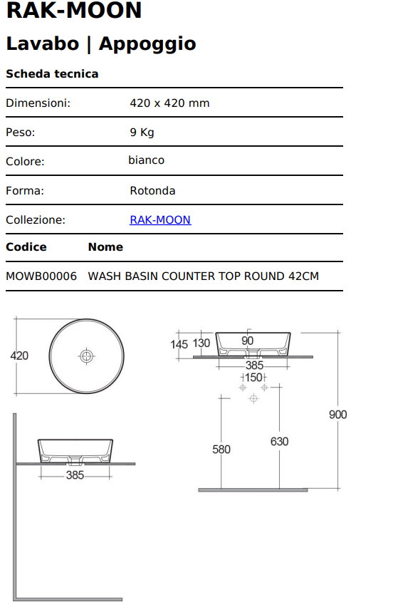 Moon è una serie di igienici sanitari del marchio Rak Ceramica che presenta la Bacinella Lavabo Tondo da Appoggio in Ceramica dal bordo ultrasottile. La finitura è in Ceramica Bianco. Questo lavabo da appoggio è senza il Sistema Troppopieno e senza Rubinetteria - Misure del Lavabo 42 cm x 42 cm x h 13 cm.