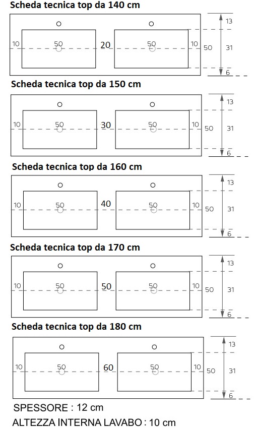 Dimensioni Top + vasca lavabo integrato: Lunghezza 140, 150, 160, 170, 180 cm
