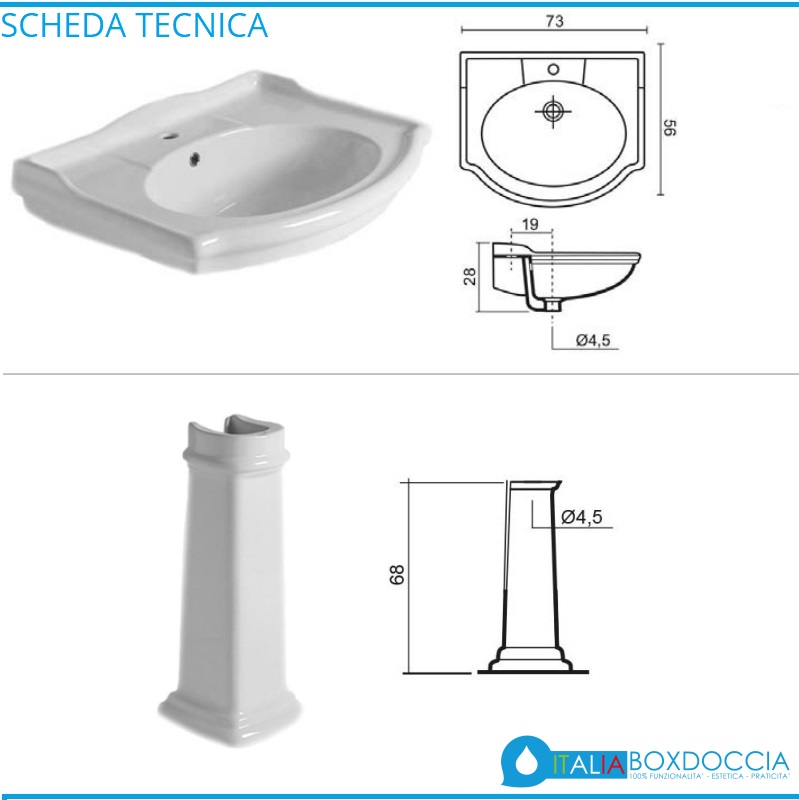Pompea è il lavabo monoforo in ceramica pensato e realizzato per completare l'arredo di bagni dallo stile vintage e retrò. Le linee classiche e senza tempo di questo sanitario ricordano l'arredo bagno di una volta, fatto di elementi affidabili, solidi e pensati per durare nel tempo. L'aspetto classico nasconde tecniche di costruzione innovative. Questo modello di lavabo con colonna misura 73 cm ed è dotato di foro troppopieno.![]()
