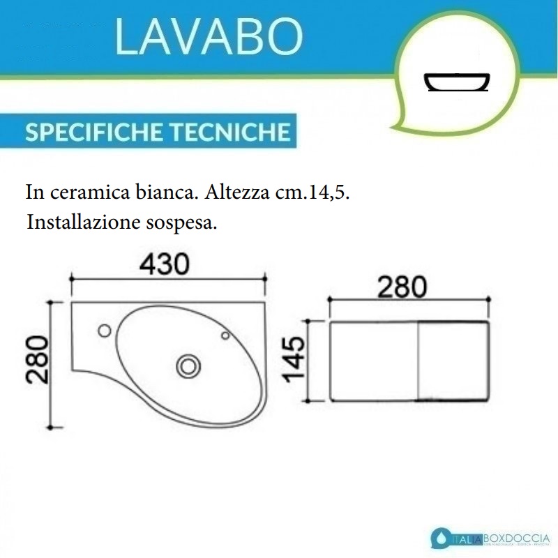 Lavabo a parete in ceramica bianca lucida 28 cm profondità x 43 cm larghezza