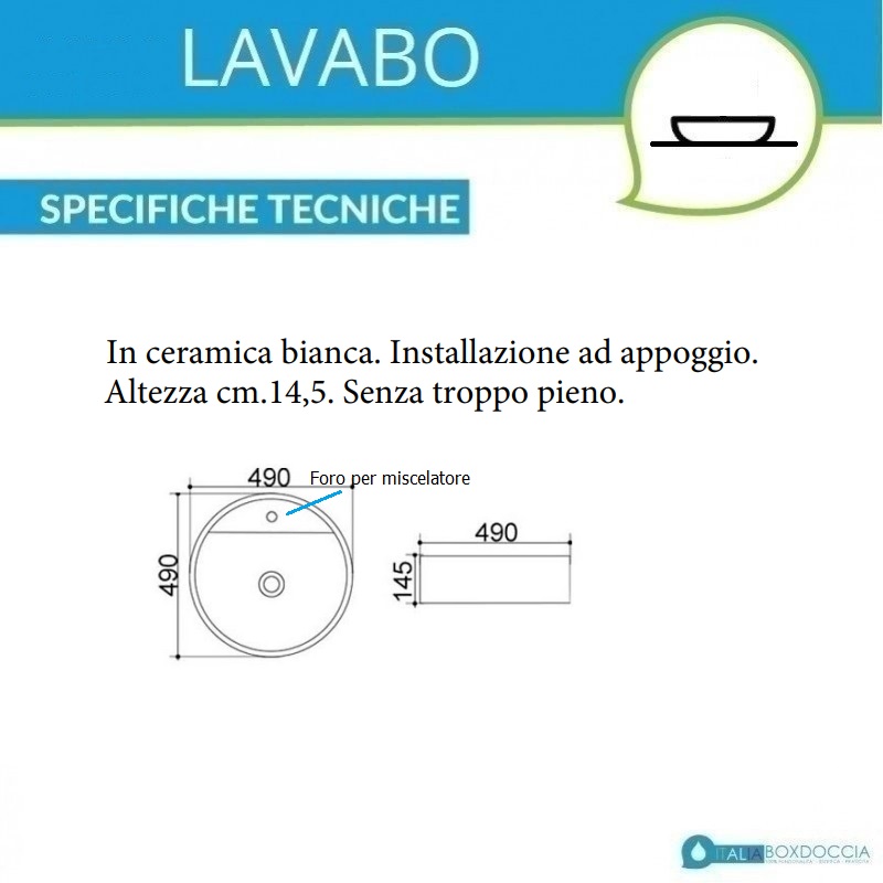 Lavabo a forma circolare d'appoggio in ceramica bianca lucida 49 cm diametro