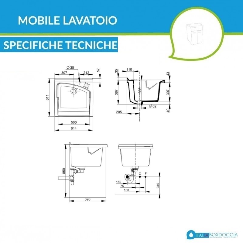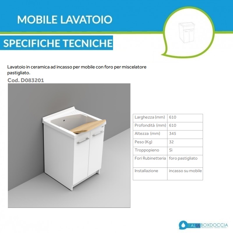Il mobile lavatoio lavanderia idrofugo bianco 61x61 cm è la soluzione ideale per la lavanderia o il bagno di servizio, anche nelle case più ristrette. Il mobile comprende l'asse strizzatoio in legno trattato resistente agli acidi per i lavaggi a mano e ha un'anta con maniglia cromata. La vasca in ceramica bianca lucida ha la predisposizione per la rubinetteria monoforo sul lato destro, da forare a propria scelta.