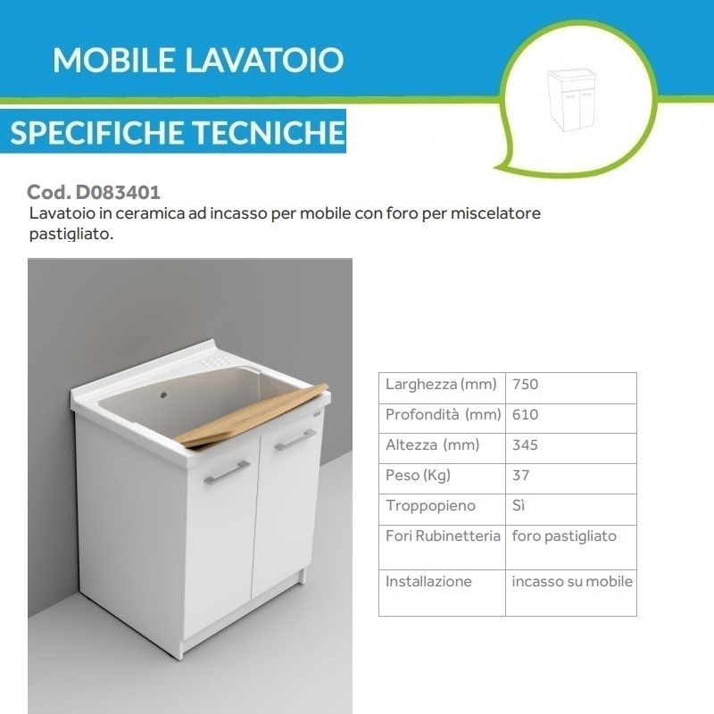 Il mobile lavatoio lavanderia idrofugo bianco 61x61 cm è la soluzione ideale per la lavanderia o il bagno di servizio, anche nelle case più ristrette. Il mobile comprende l'asse strizzatoio in legno trattato resistente agli acidi per i lavaggi a mano e ha un'anta con maniglia cromata. La vasca in ceramica bianca lucida ha la predisposizione per la rubinetteria monoforo sul lato destro, da forare a propria scelta.