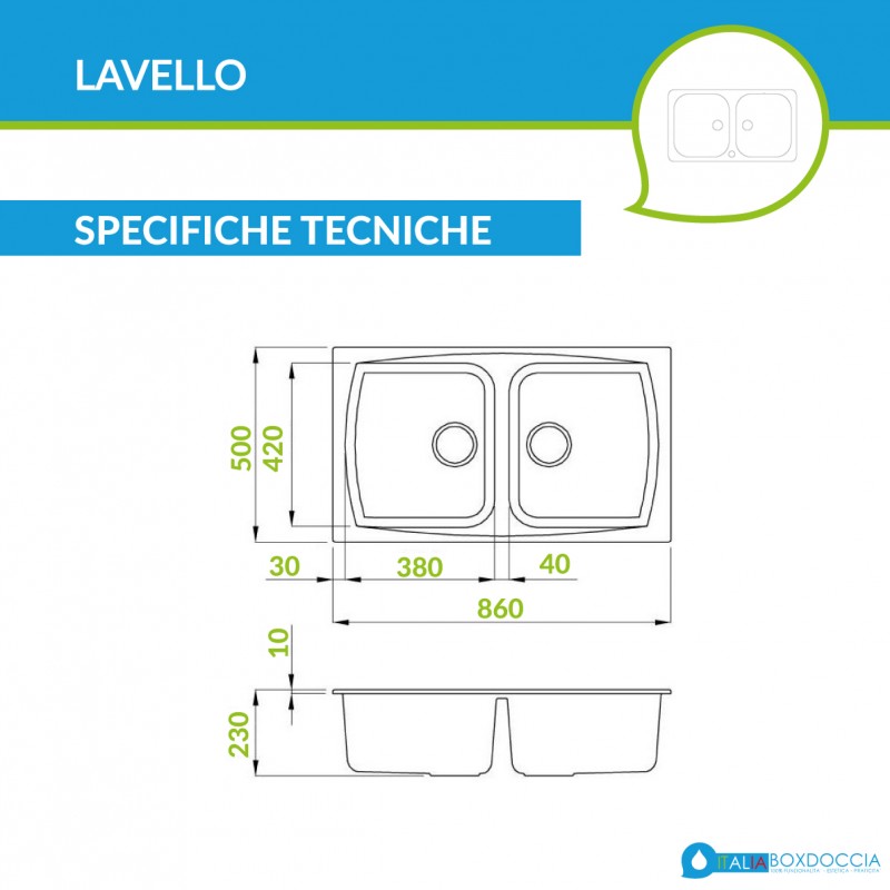 Il lavello da incasso misura complessivamente 86 x 50 cm e ha due vasche che misurano 38 x 42 cm. La finitura è in granitek. Il lavello è fornito di tutto l'occorrente per il montaggio. Questo moderno e pratico lavello è realizzato con resina acrilica di alta qualità miscelata al quarzo, per dare vita ad un materiale composito resistente alle rotture e allo sporco.