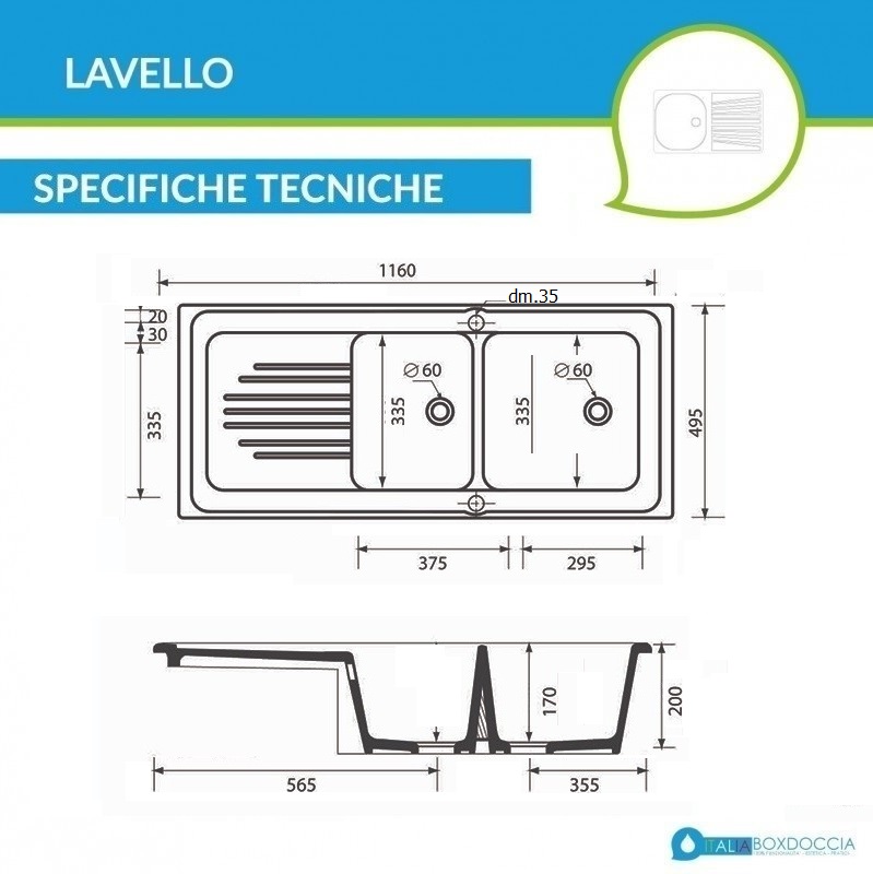 • Tipologia: lavello 116x50 cm con vasca doppia a dx e gocciolatoio a sx