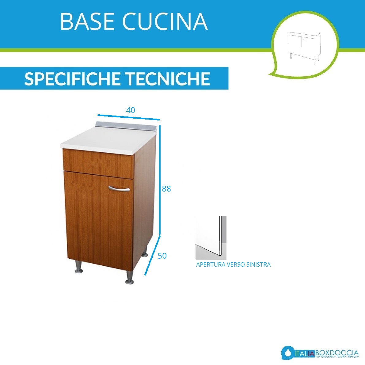 La cucina è uno degli ambienti più utilizzati della casa, quindi è importante trovare soluzioni che coniughino praticità e comfort. Questa serie di base per cucina è facile da montare e pratica da pulire, adatta all'utilizzo domestico quotidiano. La finitura superficiale è color teak, ed il prodotto è realizzato con pannellature con spessore 18 mm, in materiale idrofugo. Internamente il mobile non ha ulteriori ripiani, così da poter ottimizzare al meglio lo spazio in modo personale, garantendo l'ingombro di volumi ampi, come la pattumiera. I piedini del mobile sono regolabili con una semplice filettatura da ruotare di pochi centimetri, per compensare eventuali dislivelli del pavimento, specie per basamenti rustici o non rifiniti. Il mobile è spedito in un imballo salvaspazio ed è semplice da montare.