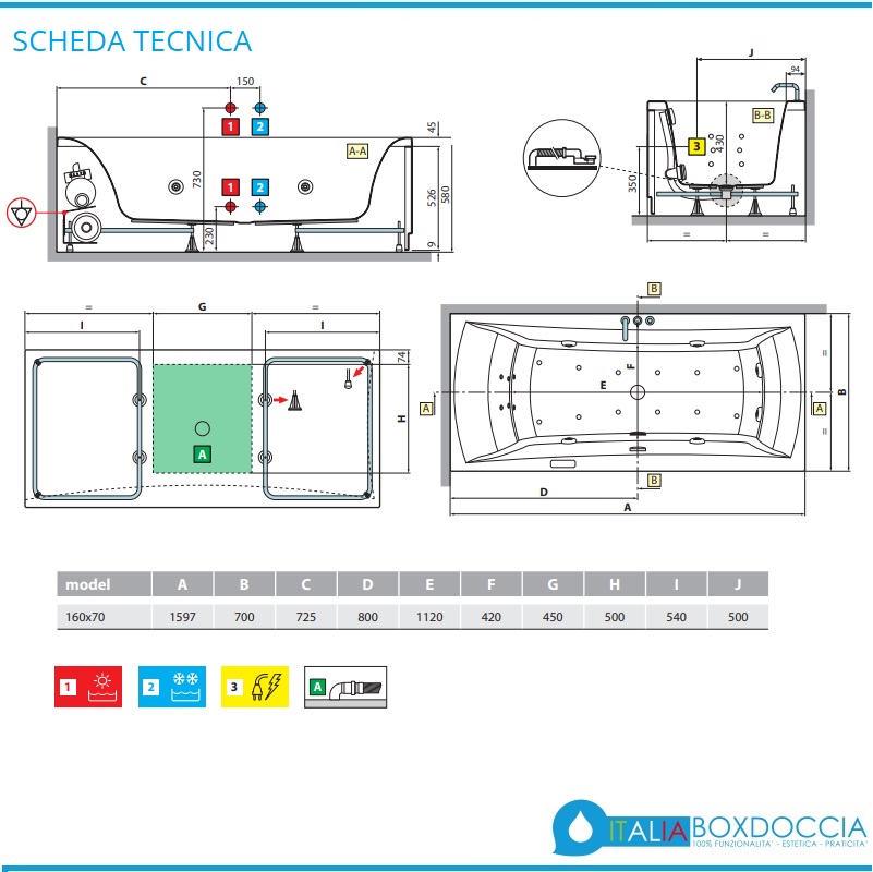 vasca 70x160 cm Novellini idromassaggio a 6 jet modello y-idro