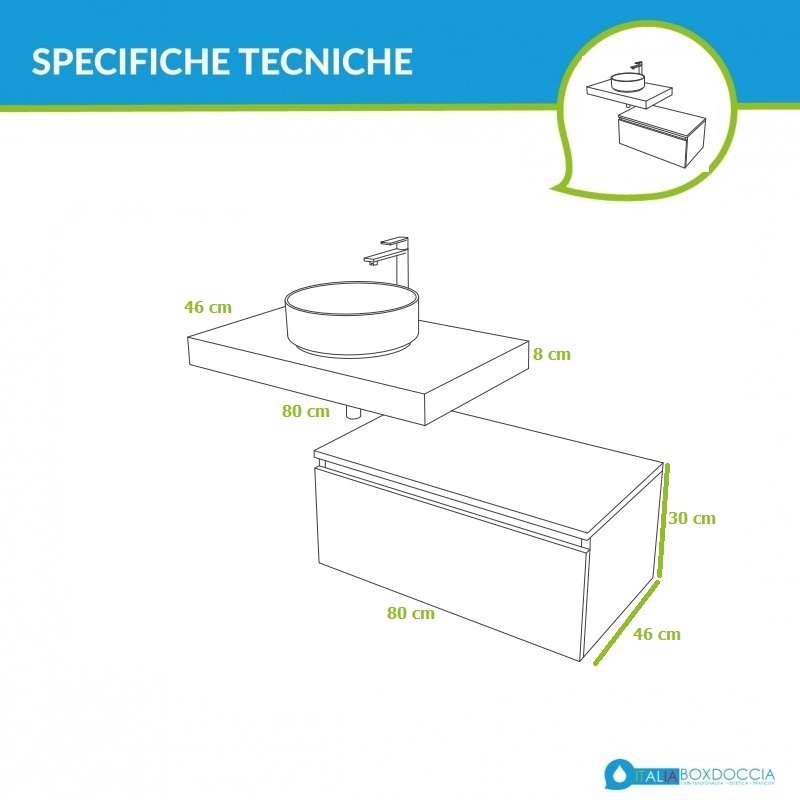 Il mensolone + cassettone da 80 cm è una composizione mobile per lavabi d'appoggio compatto ed essenziale. L'articolo che si adatta alle tue necessità senza rinunciare ad una scelta di classe. La vera soluzione salva spazio per il tuo bagno, il giusto compromesso tra vivibilità e armonia. Versatile, comodo, essenziale, per bagni dalla personalità eclettica ed elegante.
