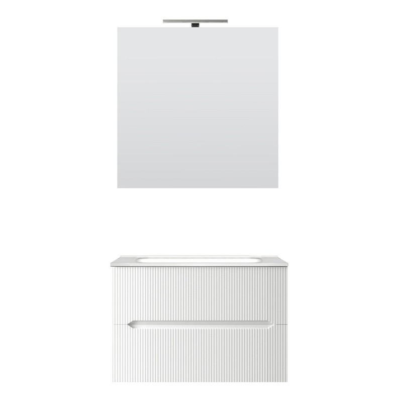 Composizione bagno moderna sospesa composta da base a due cassetti (maniglia a gola e sistema soft-closing), specchiera con luce integrata e lavabo in ceramica bianco che copre l'intera superficie del piano. Oltre ad essere funzionale e pratico per l'utilizzo di tutti i giorni decora ed abbellisce il bagno grazie alle sue linee eleganti e giovanili. Design essenziale e minimale per la collezione GINEVRA di mobili bagno sospesi.