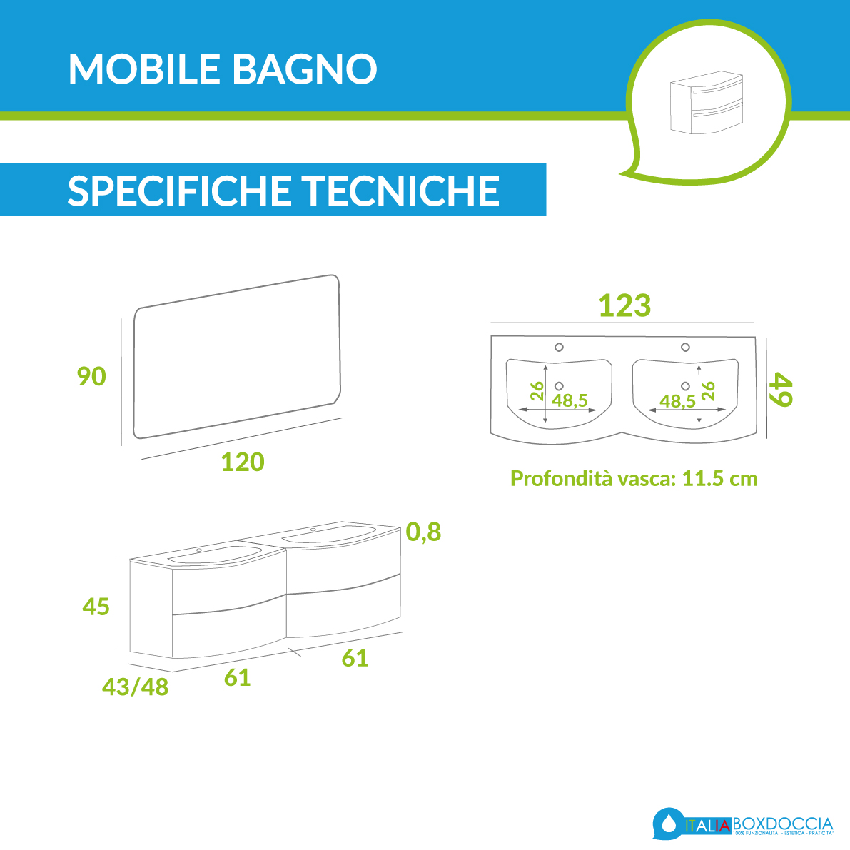 La costante ricerca su materiali, comodità di utilizzo e design, scaturisce in Dion 120, un mobile da bagno dallo stile accattivante, con fianchi e doppio lavabo in solid surface (pietra acrilica), solido materiale antibatterico, facile da pulire e rigenerabile all'occorrenza. La base è costituita da doppio cassettone con apertura Push a spinta e comodo meccanismo di chiusura rallentata soft close (blum). Dotato di specchio con con sistema di accensione Touch e retroilluminazione a LED.