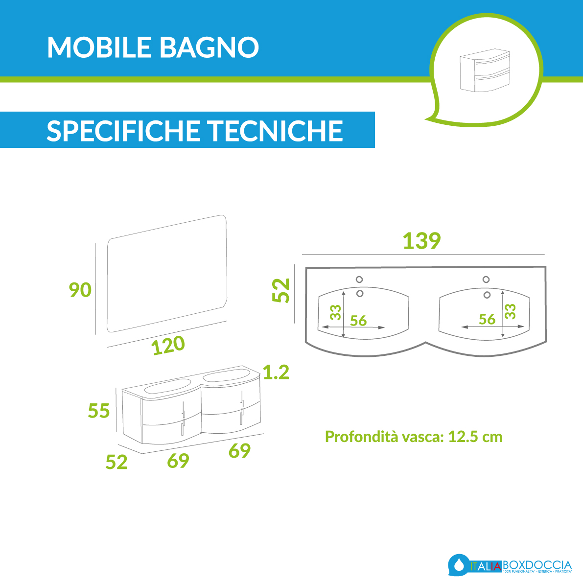 Moderno mobile bagno sospeso bianco lucido Sting 140, modello con doppio lavabo in resina bianca adagiato su base sottolavabo con quattro cassettoni con struttura in alluminio e sistema di chiusura rallentato soft close antirumore. Lo specchio senza cornice, ha finitura filo lucido ed angoli arrotondati, ed è provvisto di lampada, retroilluminazione led e altoparlante bluetooth.