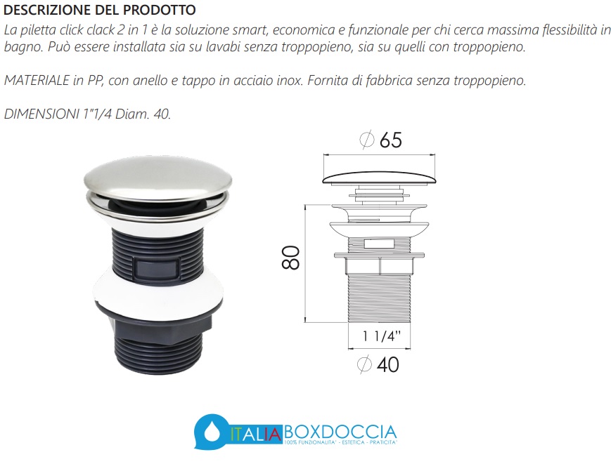 Questa piletta di scarico con attacco standard è la soluzione ideale per tutti i lavabi, compresi quelli in ceramica o acrilico e i bidet. Ideale è l'installazione su mensoloni per lavabi d'appoggio.![]()