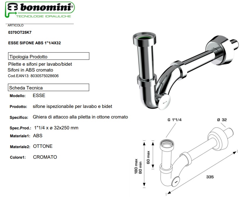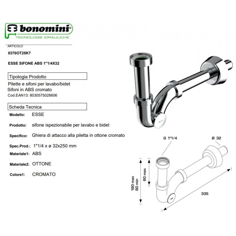 Sifone modello ESSE BONOMINI, è un indispensabile accessorio da utilizzare per i lavandini domestici e bidet. Il sifone da 1"1/4, una volta installato permetterà all'acqua dei sanitari di andare allo scarico a muro, non prima di esser passato in una curva ispezionabile facendo depositare il materiale più denso e pesante così da non intasare lo scarico.