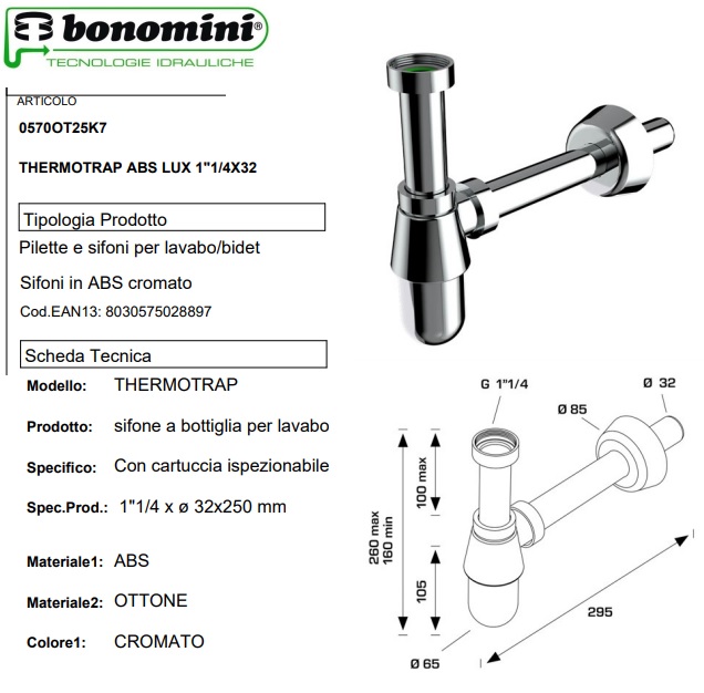 Sifone modello Thermotrap BONOMINI, è un indispensabile accessorio da utilizzare per i lavandini domestici e bidet. Il sifone da 1"1/4, una volta installato permetterà all'acqua dei sanitari di andare allo scarico a muro, non prima di esser passato in una cartuccia ispezionabile facendo depositare il materiale più denso e pesante così da non intasare lo scarico e trattenere i cattivi odori provenienti dalle tubature.