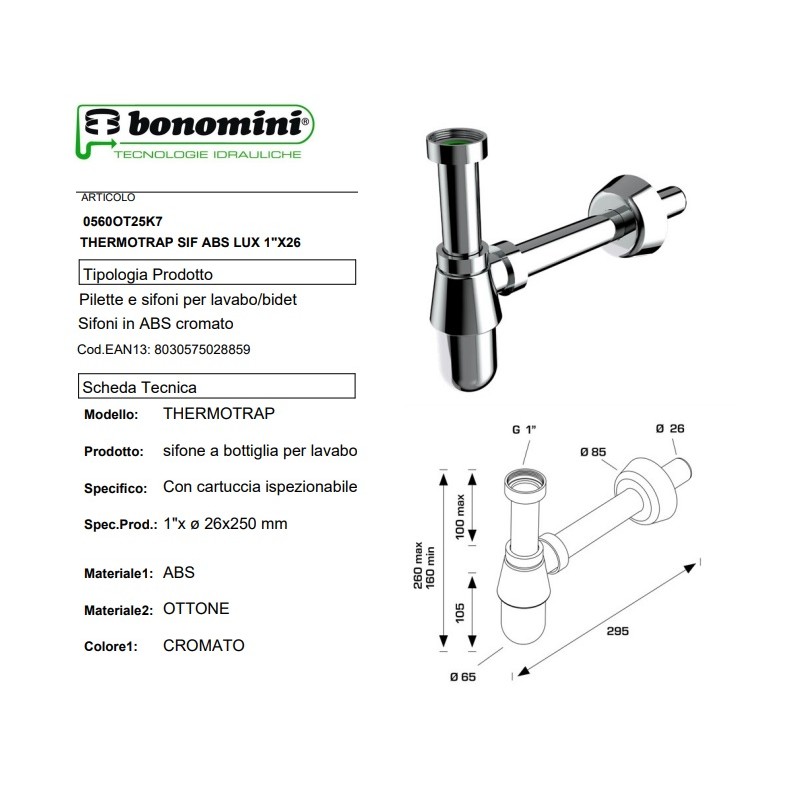 Sifone modello Thermotrap BONOMINI, è un indispensabile accessorio da utilizzare per i lavandini domestici e bidet. Il sifone da 1", una volta installato permetterà all'acqua dei sanitari di andare allo scarico a muro, non prima di esser passato in una cartuccia ispezionabile facendo depositare il materiale più denso e pesante così da non intasare lo scarico e trattenere i cattivi odori provenienti dalle tubature.