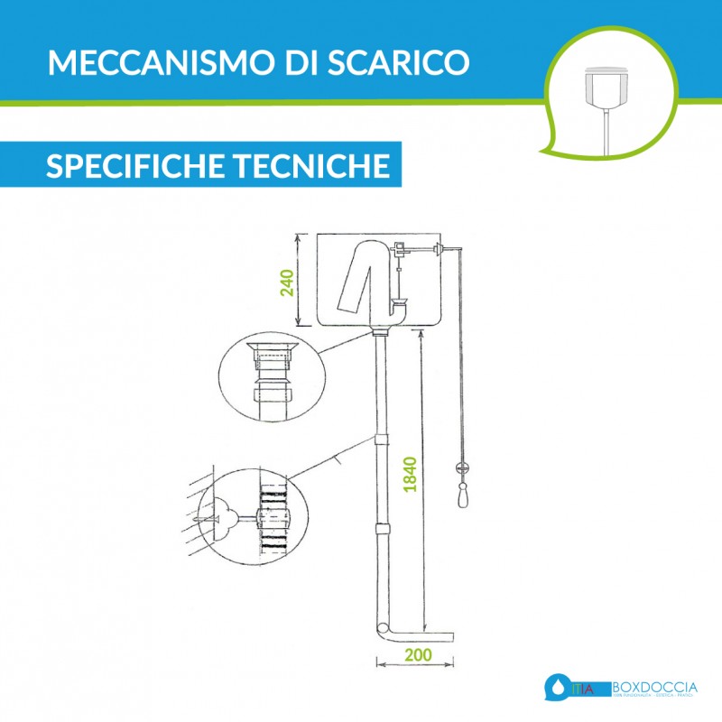 Meccanismo (altezza 24 cm) in ghisa per cassetta alta completo di tre tubi e kit catenella pull ceramica. Il meccanismo e' di materiale metallico del tipo ghisa verniciato color bronzo. La sua posizione è inserita nella cassetta alta di ceramica. Caratteristica principale è di essere un meccanismo a tirante tramite una catenella con pomello in ceramica. Il kit è composto da meccanismo galleggiante serie tre tubi e kit pull catenella e tutti le guarnizioni che necessitano all'installazione. La sua destinazione d'uso è per un bagno classico dove fa risaltare il tubo esterno di passaggio acqua il quale è di materiale ottone.