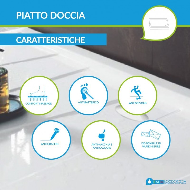 La superficie del piatto doccia è realizzata attraverso uno speciale processo produttivo che conferisce alla stessa un elegante effetto liscio antiscivolo molto moderno ed elegante. Grazie al materiale con il quale è prodotto, il piatto doccia si rivela essere molto leggero e facilmente trasportabile. Inoltre, avendo una struttura molto robusta, permette al piatto doccia di resistere al peso e alla caduta di oggetti. L'altezza del piatto doccia è di soli 6 cm e ciò lo rende adatto all'installazione da appoggio oppure a filo pavimento.