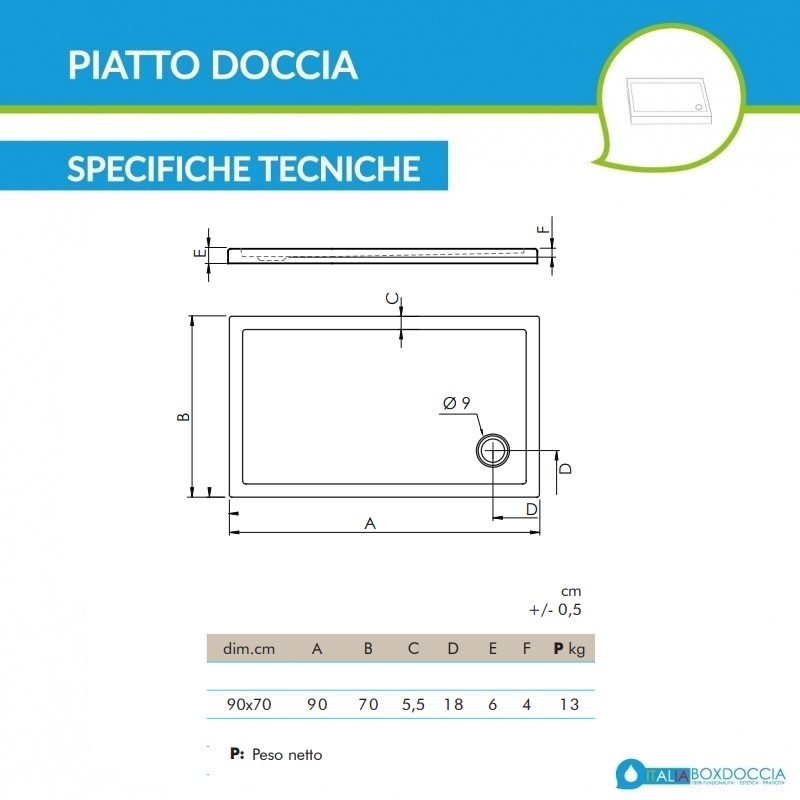 La superficie del piatto doccia è realizzata attraverso uno speciale processo produttivo che conferisce alla stessa un elegante effetto liscio antiscivolo molto moderno ed elegante. Grazie al materiale con il quale è prodotto, il piatto doccia si rivela essere molto leggero e facilmente trasportabile. Inoltre, avendo una struttura molto robusta, permette al piatto doccia di resistere al peso e alla caduta di oggetti. L'altezza del piatto doccia è di soli 6 cm e ciò lo rende adatto all'installazione da appoggio oppure a filo pavimento.