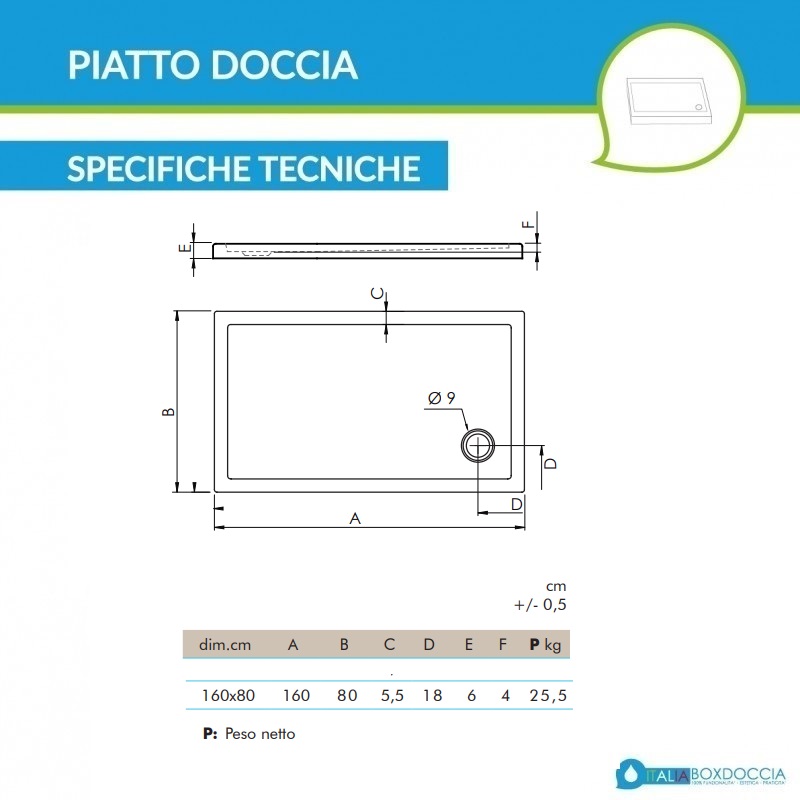 La superficie del piatto doccia è realizzata attraverso uno speciale processo produttivo che conferisce alla stessa un elegante effetto liscio antiscivolo molto moderno ed elegante. Grazie al materiale con il quale è prodotto, il piatto doccia si rivela essere molto leggero e facilmente trasportabile. Inoltre, avendo una struttura molto robusta, permette al piatto doccia di resistere al peso e alla caduta di oggetti. L'altezza del piatto doccia è di soli 6 cm e ciò lo rende adatto all'installazione da appoggio oppure a filo pavimento.
