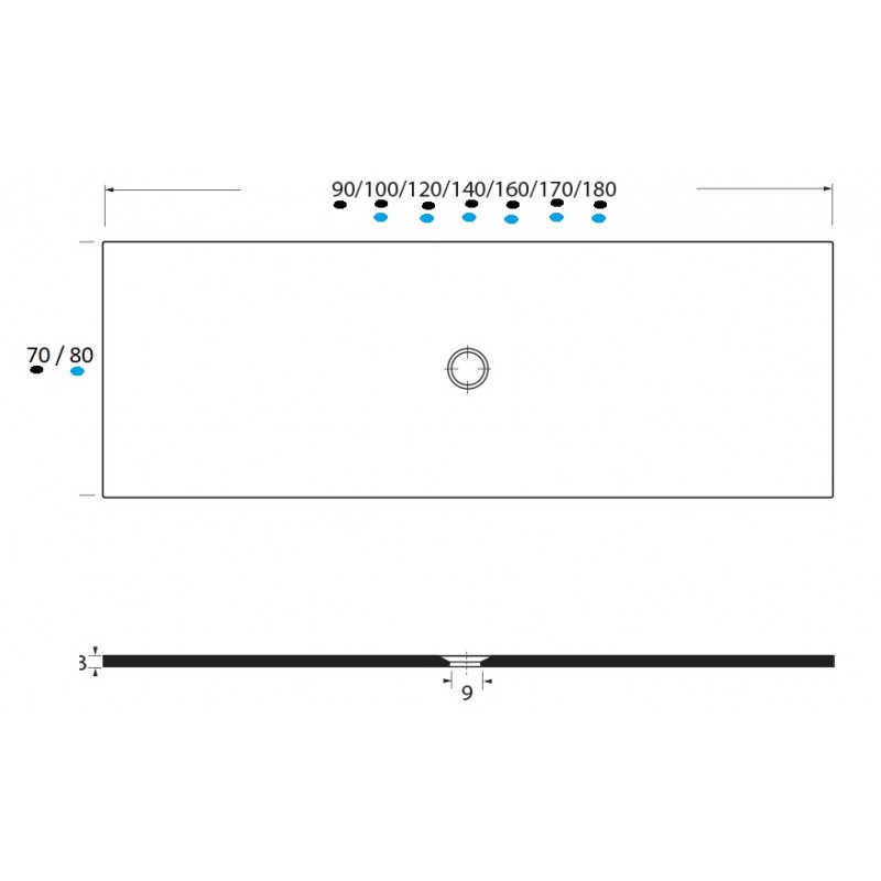 Piatto doccia Uniko super sottile in ceramica rettangolare design ultra moderno Altezza 3 cm, smaltato su 4 lati tortora finitura opaca predisposto per piletta di scarico sifonata diametro 90 mm. Foro piletta al centro del piatto doccia.