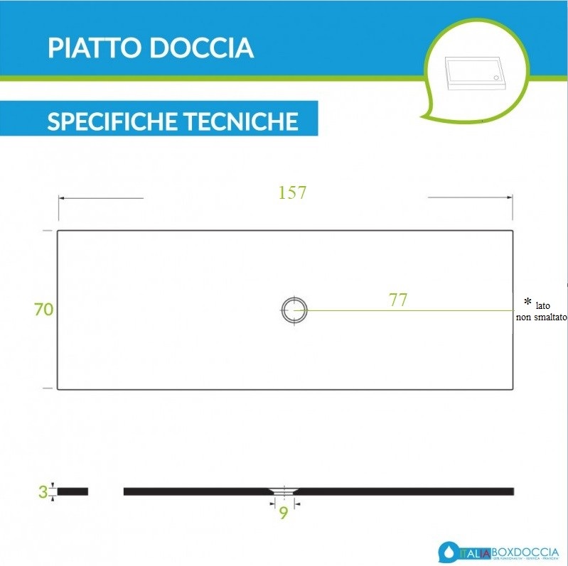 Piatto doccia Uniko super sottile in ceramica rettangolare design ultra moderno Altezza 3 cm, smaltato su 4 lati bianco opaco mat (cotone) predisposto per piletta di scarico sifonata diametro 90 mm con finitura standard Liscia. Foro piletta al centro del piatto doccia.