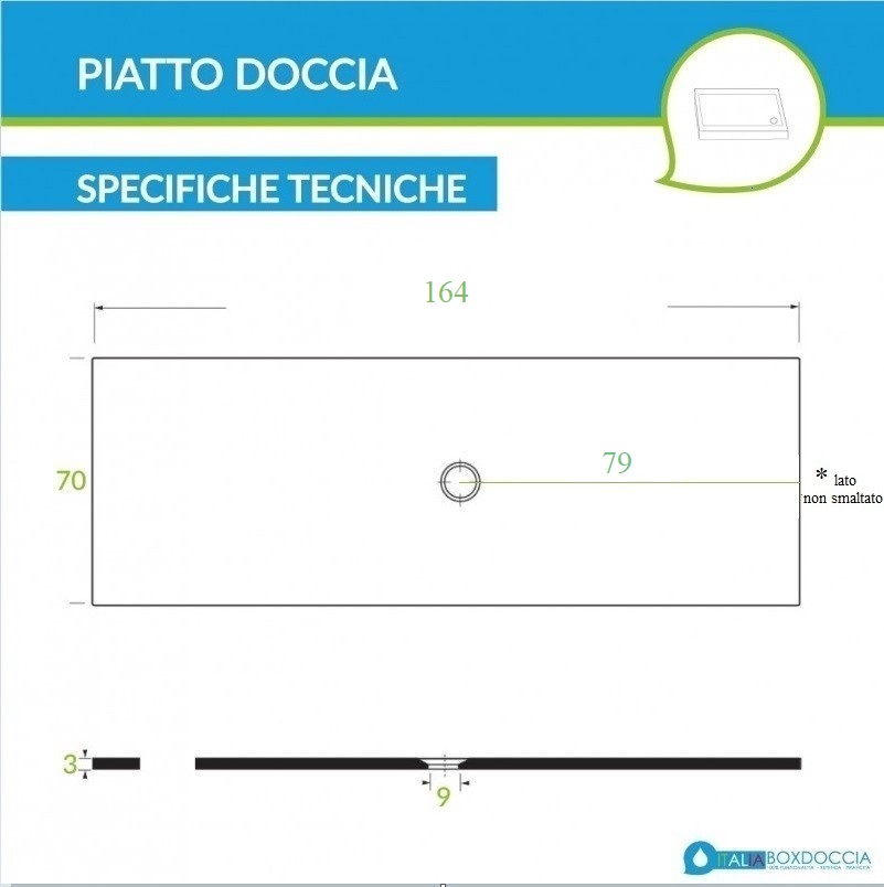 Piatto doccia Uniko super sottile in ceramica rettangolare design ultra moderno Altezza 3 cm, smaltato su 4 lati bianco opaco mat (cotone) predisposto per piletta di scarico sifonata diametro 90 mm con finitura standard Liscia. Foro piletta al centro del piatto doccia.
